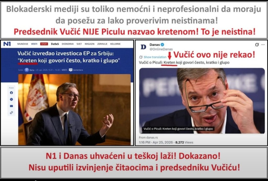 - Oni su danas predsedniku Vučiću stavili reči u usta, izmislili su da je predsednik Vučić, Tonina Piculu nazvao kretenom. IZMISLILI ! Predsednik Vučić je o Piculi rekao: "Što se tiče glupih poruka, on govori često, ali obično je to kratko i glupo" - stoji u objavi.