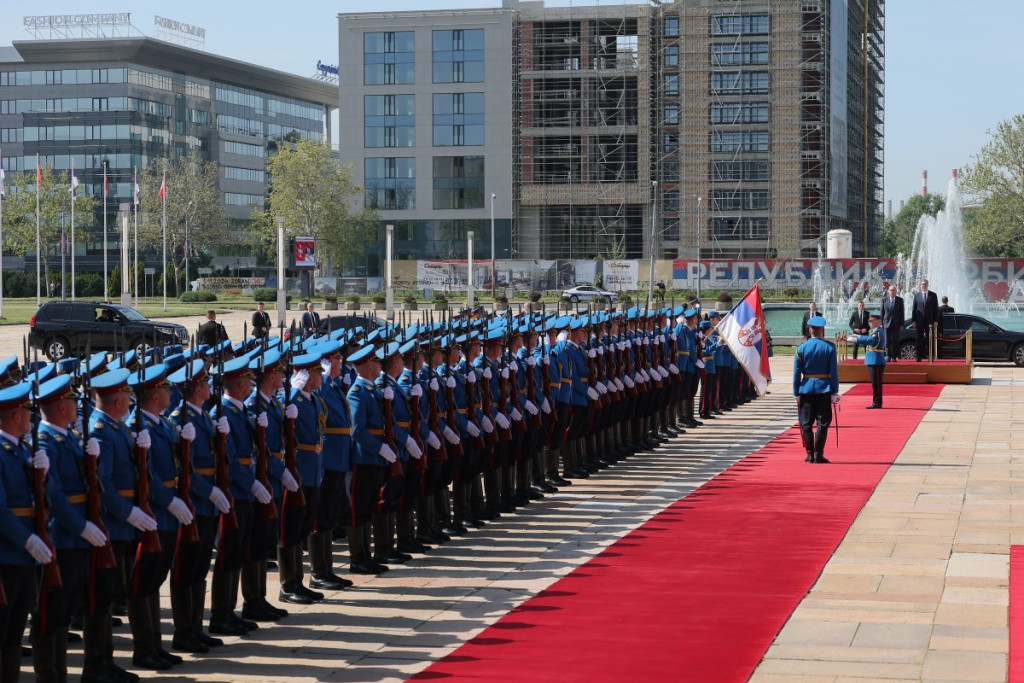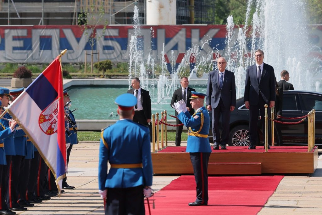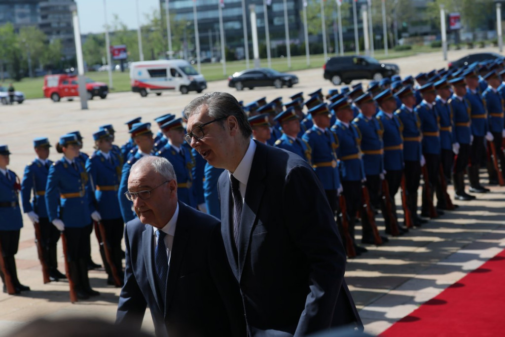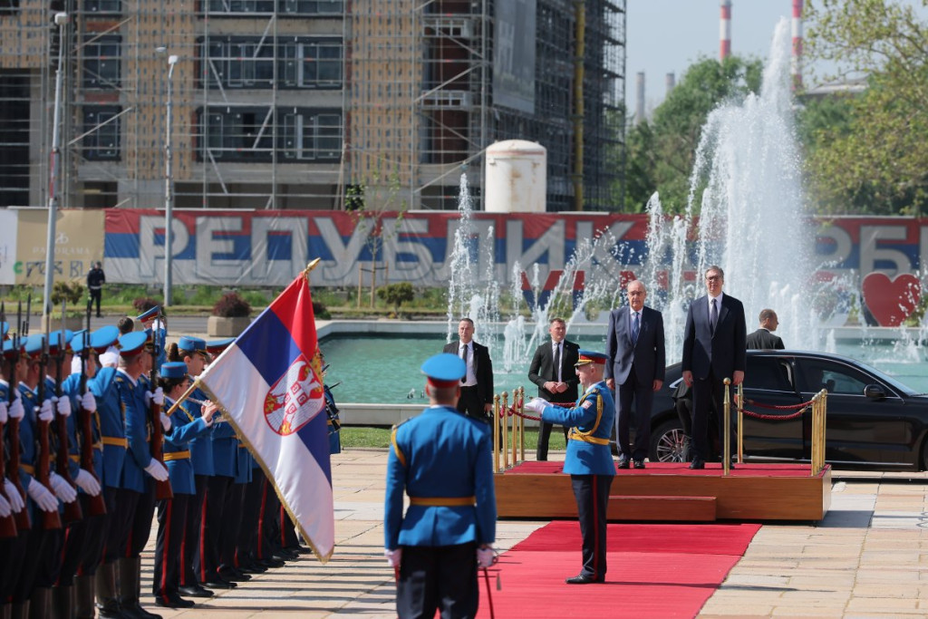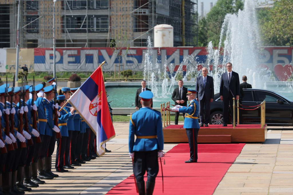 Predsednik Vučić svečano je dočekao predsednika Švajcarske Konfederacije Gija Parmelana ispred Palate Srbija uz sve državne počasti - intoniranje himni, crveni tepih i počasnu smotru Garde, posle čega se švajcarski predsednik naklonio srpskoj trobojci.