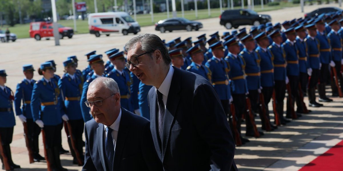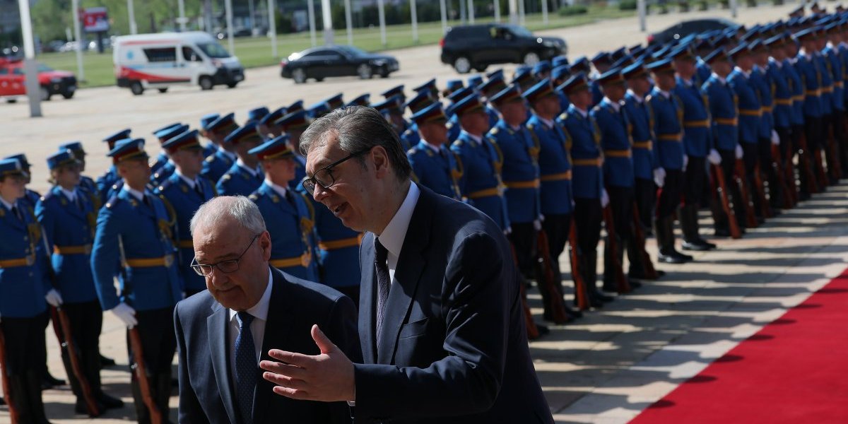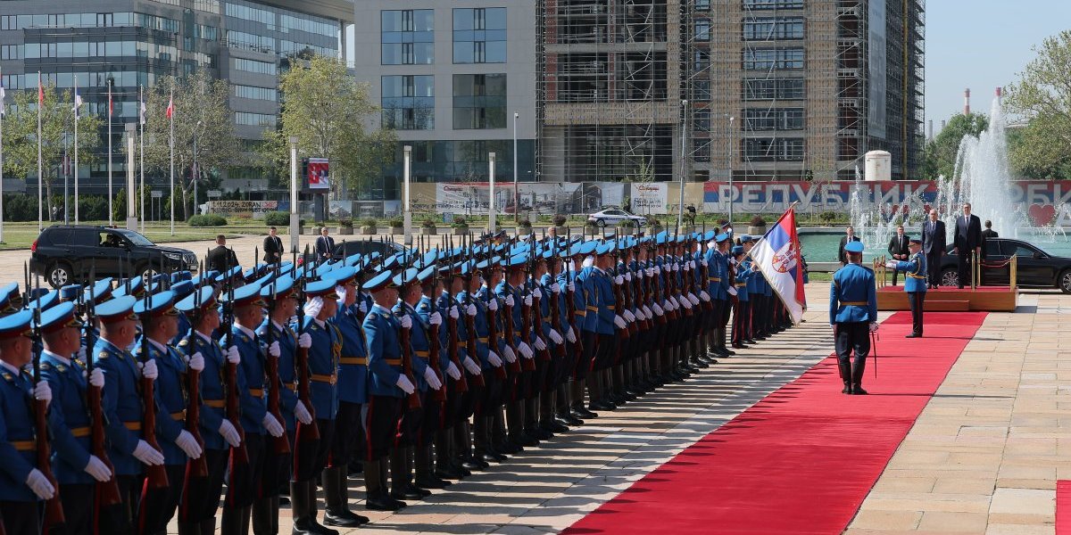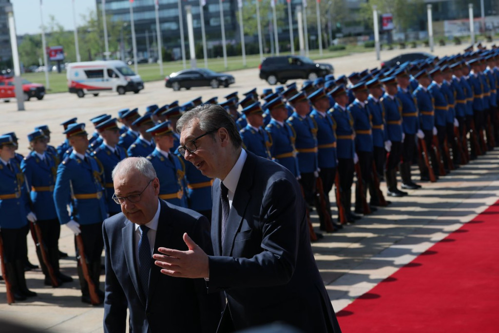 Predsednik Vučić svečano je dočekao predsednika Švajcarske Konfederacije Gija Parmelana ispred Palate Srbija uz sve državne počasti - intoniranje himni, crveni tepih i počasnu smotru Garde, posle čega se švajcarski predsednik naklonio srpskoj trobojci.