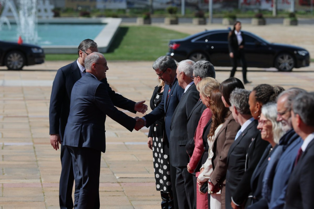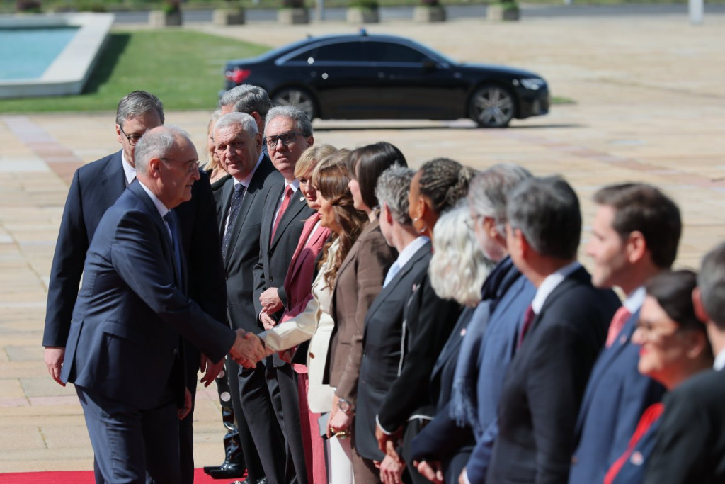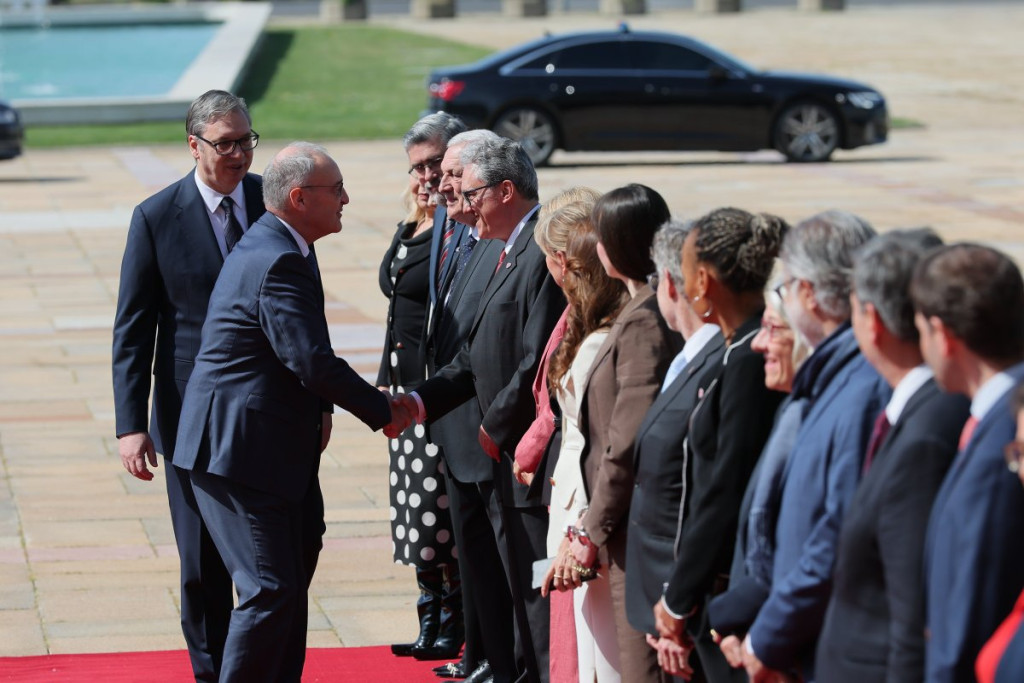 Posle svečanog dočeka i upoznavanja obojice predsednika sa članovima delegacija obeju zemalja, prema uobičajenom protokolu ušli su u Palatu "Srbija" gde je održan razgovor u četiri oka.