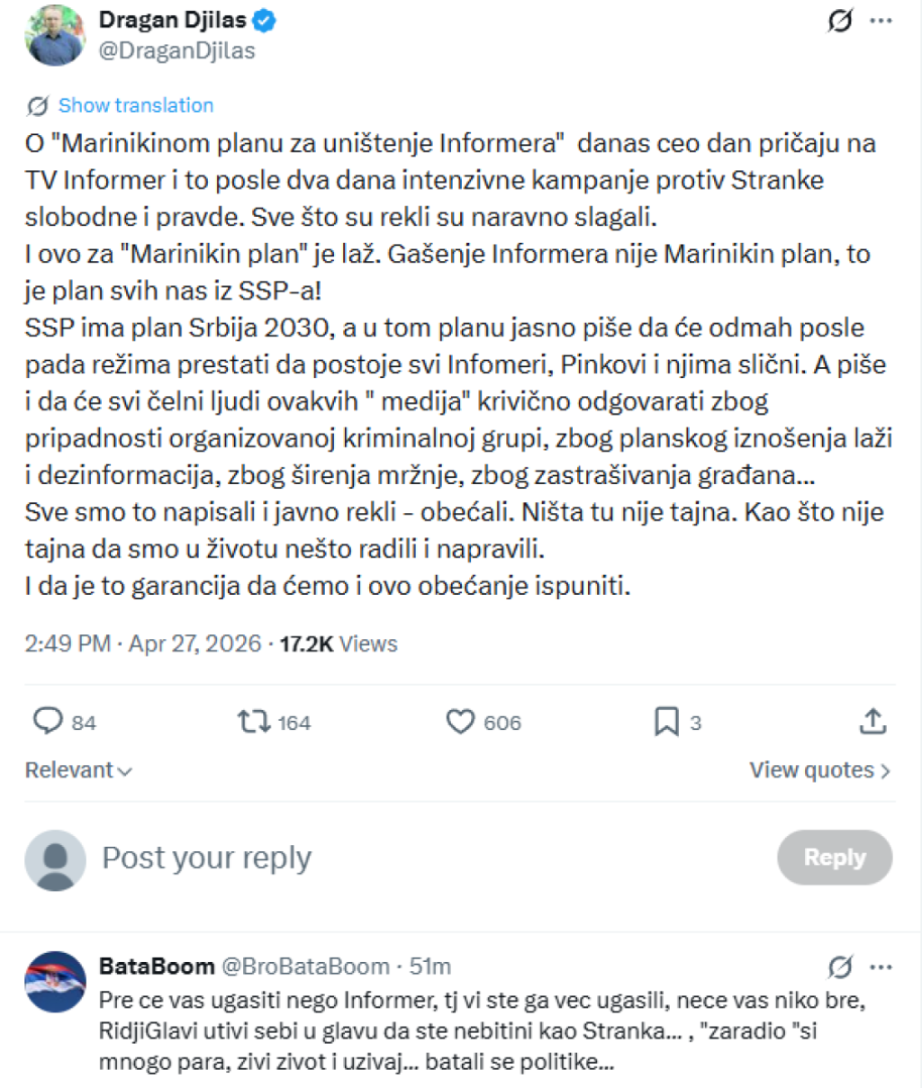 - O "Marinikinom planu za uništenje Informera" danas ceo dan pričaju na TV Informer i to posle dva dana intenzivne kampanje protiv Stranke slobodne i pravde. Sve što su rekli su naravno slagali. I ovo za "Marinikin plan" je laž. Gašenje Informera nije Marinikin plan, to je plan svih nas iz SSP-a! SSP ima plan Srbija 2030, a u tom planu jasno piše da će odmah posle pada režima prestati da postoje svi Infomeri, Pinkovi i njima slični. A piše i da će svi čelni ljudi ovakvih "medija" krivično odgovarati zbog pripadnosti organizovanoj kriminalnoj grupi, zbog planskog iznošenja laži i dezinformacija, zbog širenja mržnje, zbog zastrašivanja građana... Sve smo to napisali i javno rekli - obećali. Ništa tu nije tajna. Kao što nije tajna da smo u životu nešto radili i napravili. I da je to garancija da ćemo i ovo obećanje ispuniti - napisao je Đilas na Iksu.