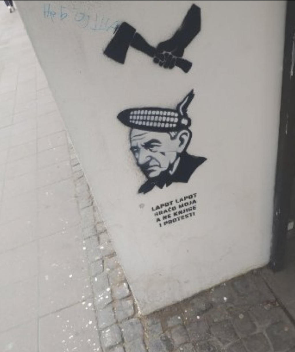 - Lapot, Lapot, braćo moja, a ne knjige i protesti - piše u skandaloznoj poruci na kojoj je prikazan stariji čovek sa sekirom iznad i kukuruzom na glavi.