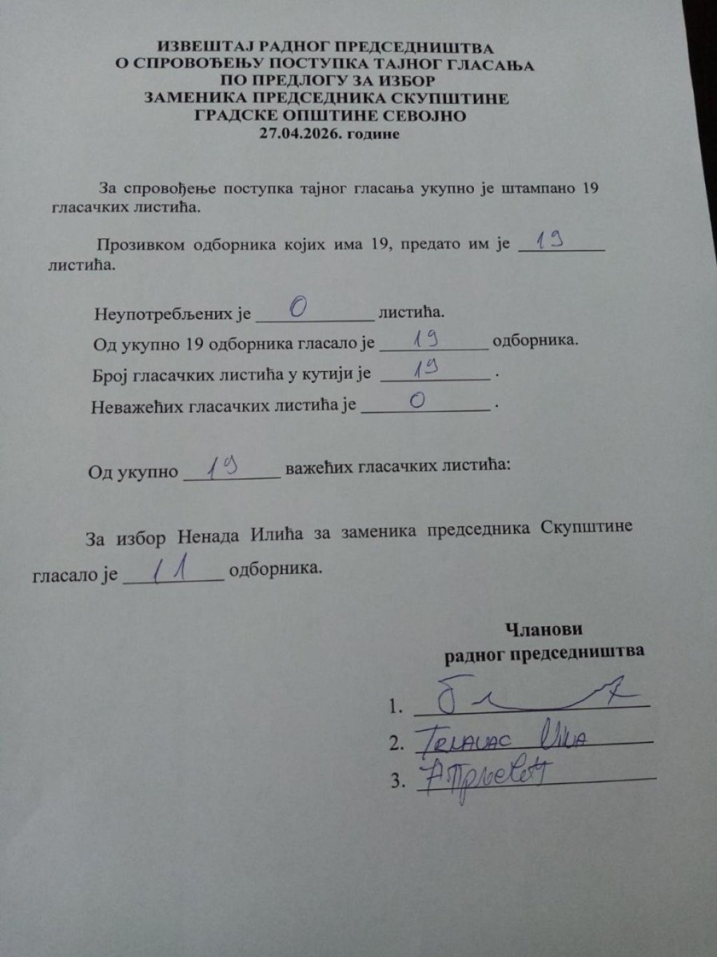 Na prvoj konstitutivnoj sednici SO Sevojno, sasvim očekivano, za izbor "vučićevskog" kandidata za predsednika opštine glasali su svi naprednjaci i Stamatovićev odbornik - rezultat je, dakle, bio: 10:9.