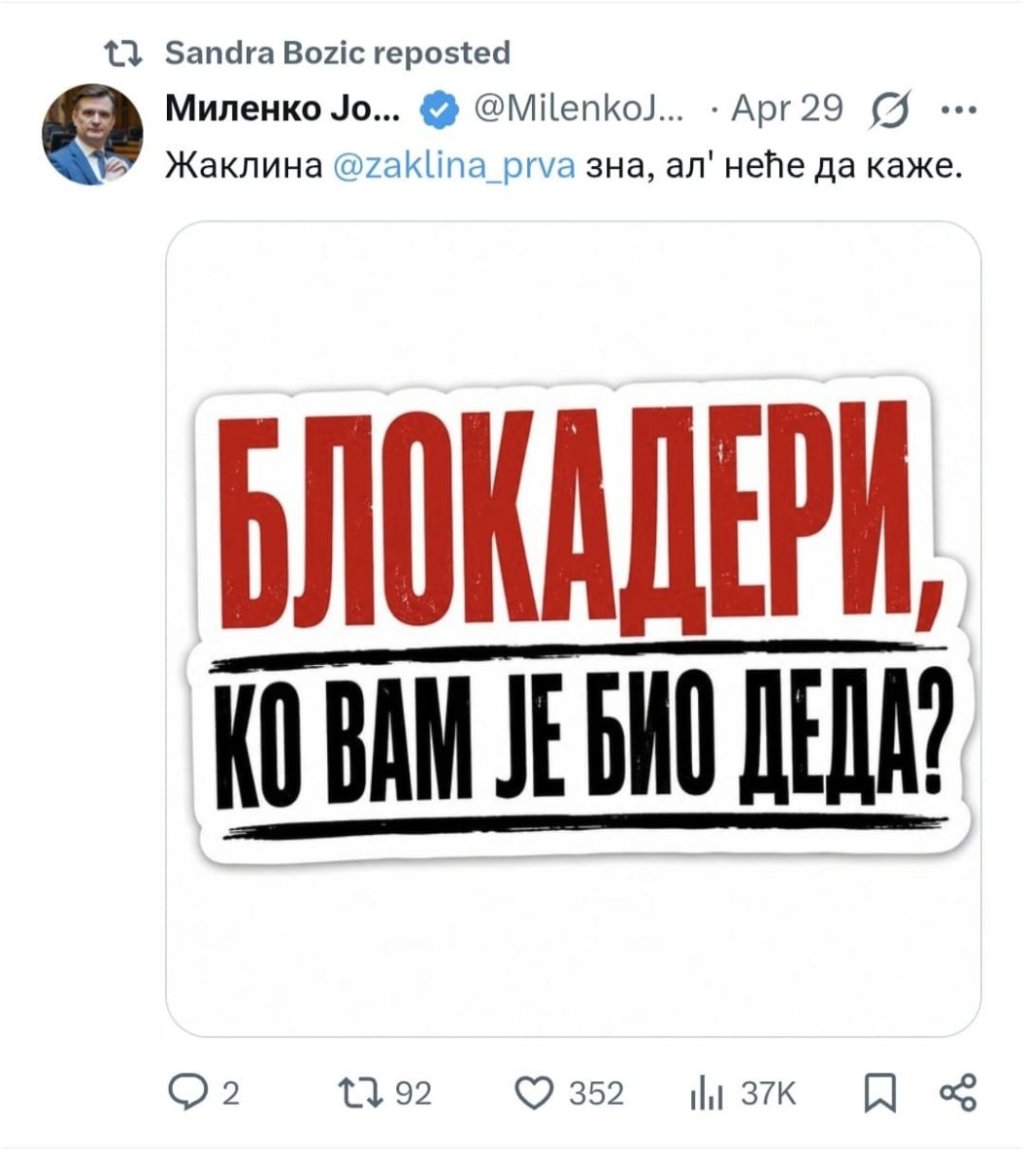 Potpredsednik Srpske napredne stranke Milenko Jovanov na društvenoj mreži Iks raskrinkao najveći blam blokadera N1 - aludirajući na mega blam tajkunske novinarke Žakline Tatalović.