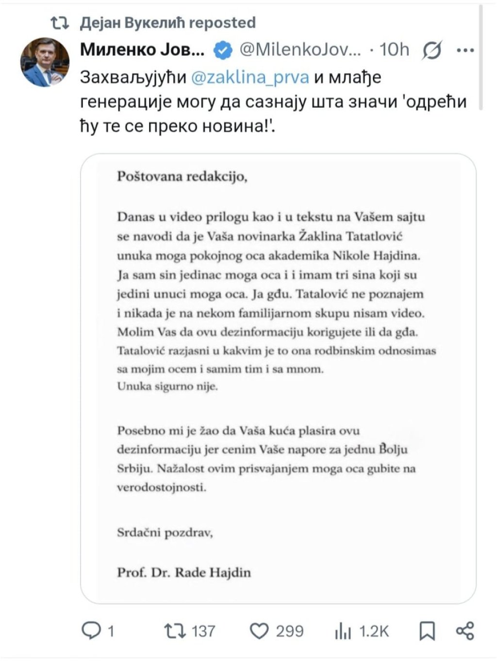 Prethodno je poručio i da "Žaklina zna, ali neće da kaže", aludirajući na navode o njenim porodičnim vezama, a podelio je i pismo profesora Rada Hajdina, koji demantuje da je ona u rodbinskom odnosu sa akademikom Nikolom Hajdinom.