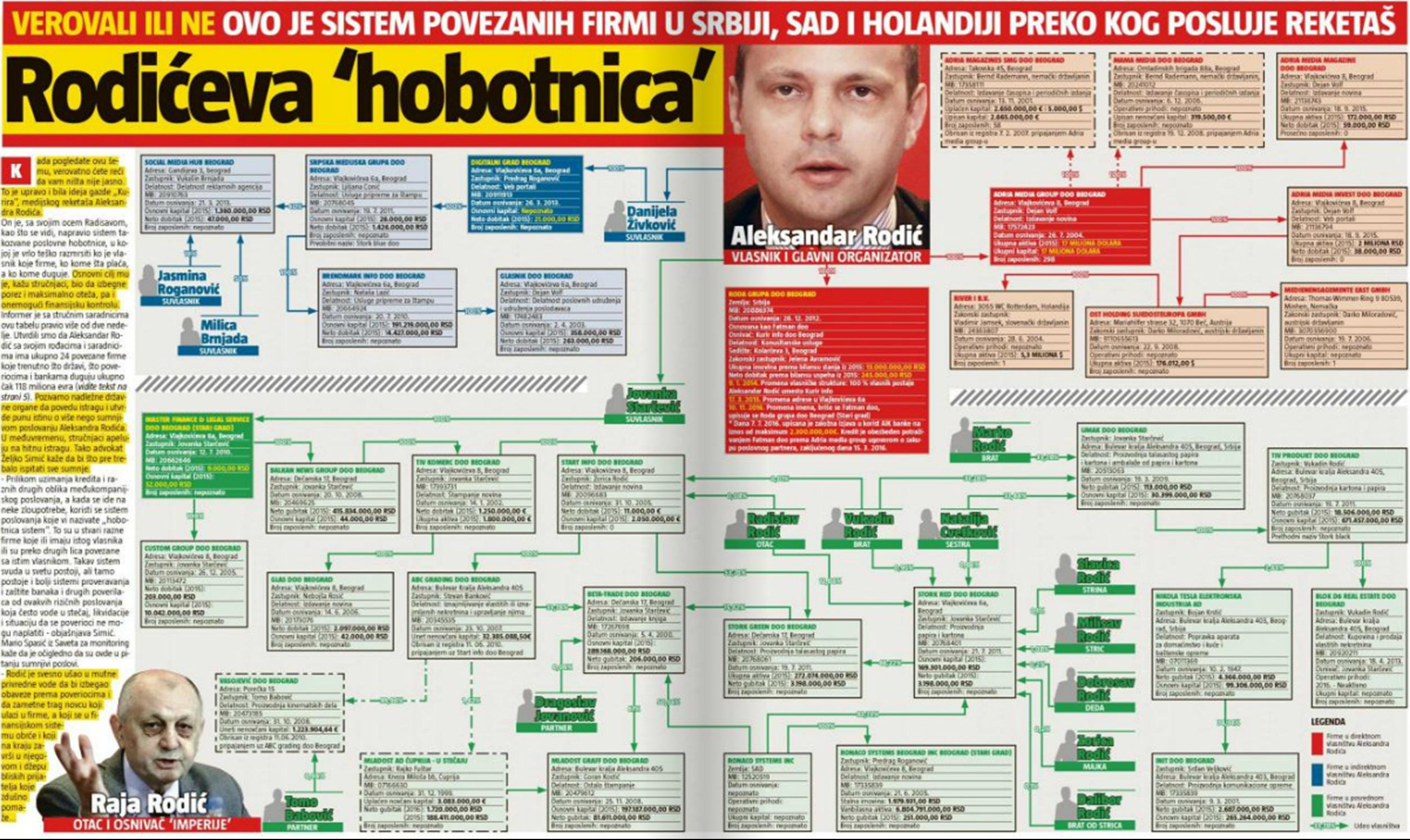 Naša istraga je pokzala da je Rodić zapravo napravio takozvani "hobotnica sistem poslovanja", sačinjen od firmi koje su registrovane na njegovo ime, ime njegovog oca Radisava, brata Vukadina i još 22 ljudi, mahom rođaka i bliskih prijatelja.