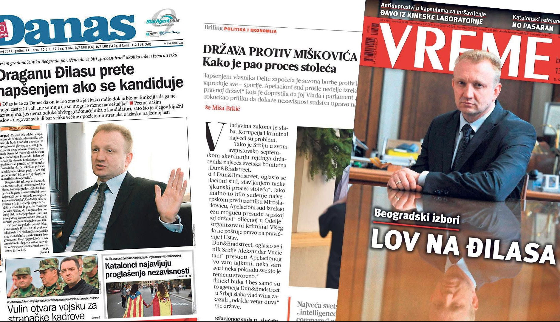 Sve napred navedeno konkretno dokazuju naslovne strane "Vremena" i "Danasa", sa kojih se Đilas predstavlja kao junak i lider opozicije, a Mišković proglašava za nevinu žrtvu političkog progona!?! Na sve to u najnovijem broju "Nedeljnika" objavljena je i velika "ekspertska analiza" Miškovićevog omiljenog ekonomskog novinara Miše Brkića u kojoj se tvrdi da je gazda "Delte" pošten biznismen koji je žrtva strašnog političkog progona!?!