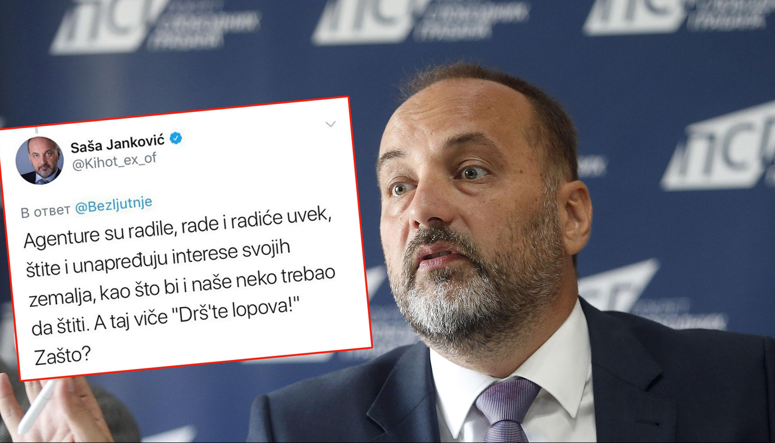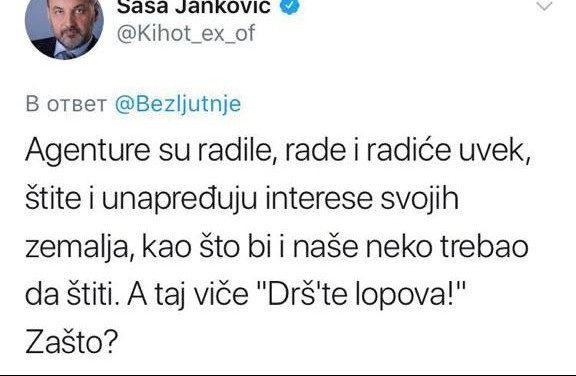 Kao što je pre samo nekoliko dana, tačnije nešto pre nego što je dobio grčeve od stresa i besa u hotelskoj sobi u centru Beča, otvoreno stao u odbranu člana Predsedništva BiH Bakira Izetbegovića koji je najavio da će Sarajevo priznati nezavisnost lažne države Kosovo, Janković sada brani i strane agente koji prema pisanju medija pojačano deluju na teritoriji Srbije.