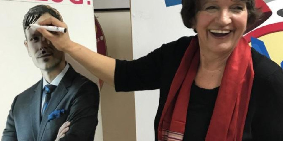 Ona je u ovom sramnom činu očigledno uživala jer se na fotografijama smeje dok crta nacističke simbole na plakatu na kojem je bio gradonačelnik Beograda.