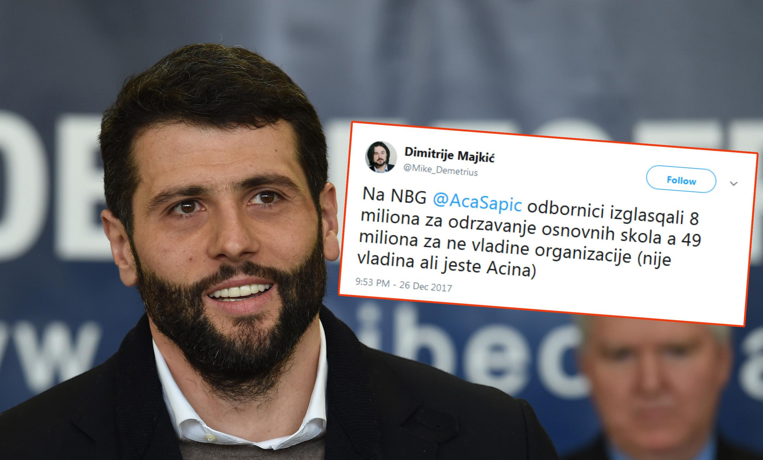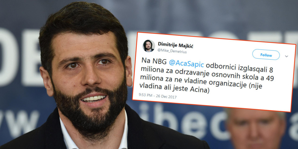 - Na NBG odbornici Aleksandra Šapića izglasali 8 miliona za održavanje osnovnih škola, a 49 miliona za nevladine organizacije (nije vladina ali jeste Acina) - napisao je Majkić na Tviteru, i ubrzo nastavio: