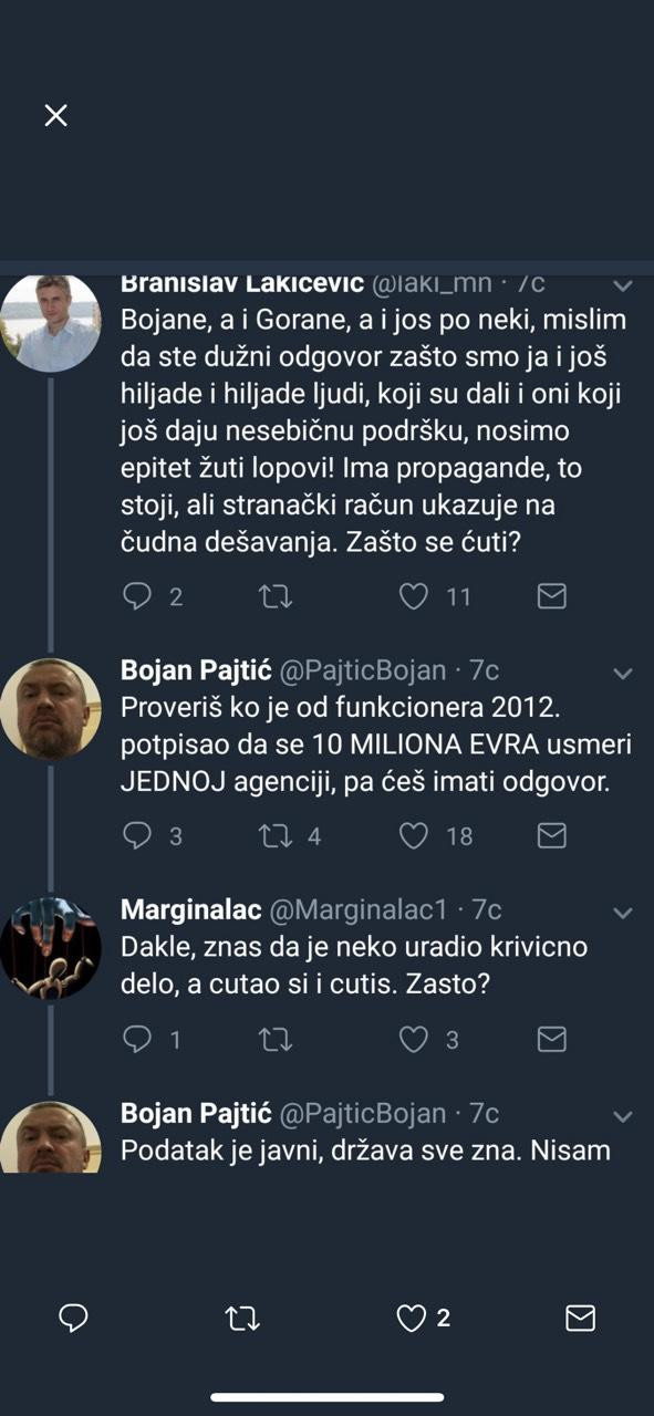 U jednom momentu je čak za pljačku DS posredno optužio i svog prethodnika u stranci, a sada izbornog pajtaša Dragana Đilasa, napisavši da treba "da se proveri ko je od funkcionera 2012. potpisao da se 10 miliona evra usmeri jednoj agenciji". A javna je tajna da su tih godina kampanje uglavnom rađene preko agencije - Dragana Đilasa!