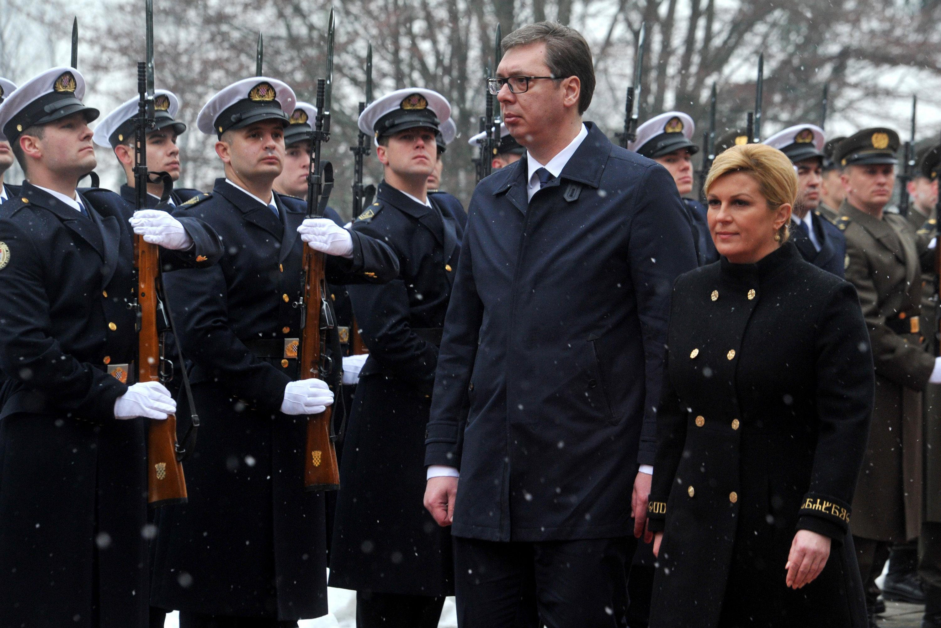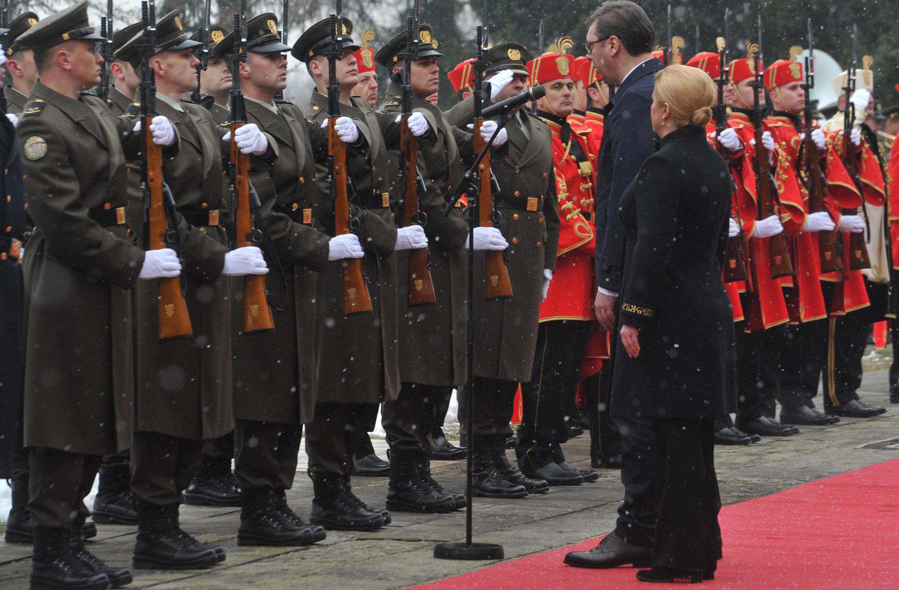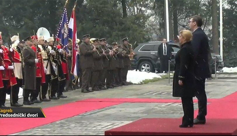 10.37 - Predsednica Hrvatske kolinda Grabar Kitarović dočekala je Aleksandra Vučića ispred palate na Pantovčaku. U čast predsednika Srbije postrojena je počasna straža.
