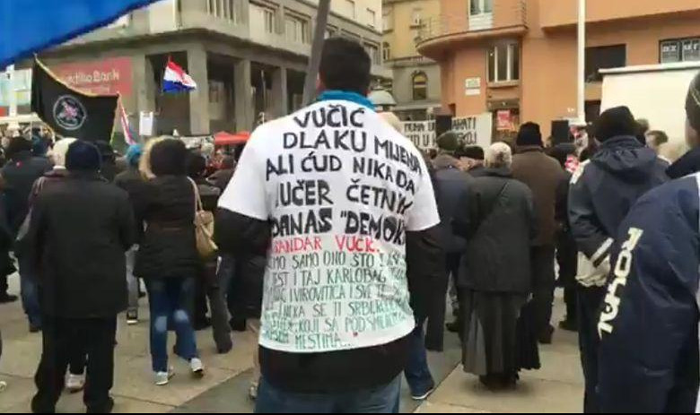 11.15 - Na protestu hrvatskih ekstremista na Trgu bana Jelačića sa bine se čuo ustaški pozdrav "Za dom", a masa je odgovorila "Spremni".