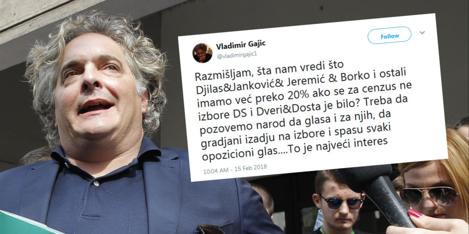 - Razmišljam, šta nam vredi što Đilas, Janković, Jeremić, Borko i ostali imamo već preko 20 odsto ako se za cenzus ne izbore DS i Dveri i Dosta je bilo? Treba da pozovemo narod da glasa i za njih, da građani izađu na izbore i spasu svaki opozicioni glas....To je najveći interes - napisao je Gajić.