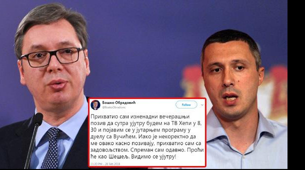 - Prihvatio sam iznenadni večerašnji poziv da sutra ujutru budem na TV Hepi u 8 i 30 i pojavim se u jutarnjem programu u duelu sa Vučićem. Iako je nekorektno da me ovako kasno pozivaju, prihvatio sam sa zadovoljstvom. Spreman sam odavno. Proći će kao Šešelj. Vidimo se ujutru - napisao je sinoć Obradović.