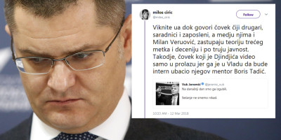 - Viknite ua dok govori čovek čiji drugari, saradnici i zaposleni, a među njima i Milan Veruović, zastupaju teoriju trećeg metka i deceniju i po truju javnost. Takođe, čovek koji je Đinđića video samo u prolazu jer ga je u Vladu da bude intern ubacio njegov mentor Boris Tadić - napisao je Ćirić.