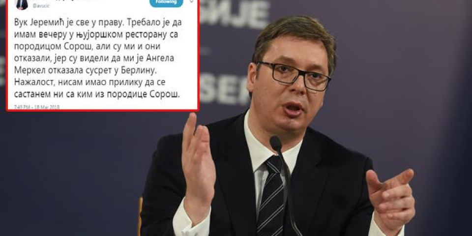 - Vuk Jeremić je sve u pravu. Trebalo je da imam večeru u njujorškom restoranu sa porodicom Soroš, ali su mi i oni otkazali, jer su videli da mi je Angela Merkel otkazala susret u Berlinu. Nažalost, nisam imao priliku da se sastanem ni sa kim iz porodice Soroš.