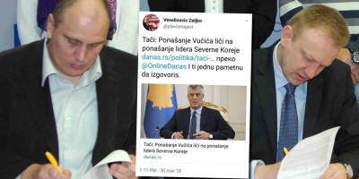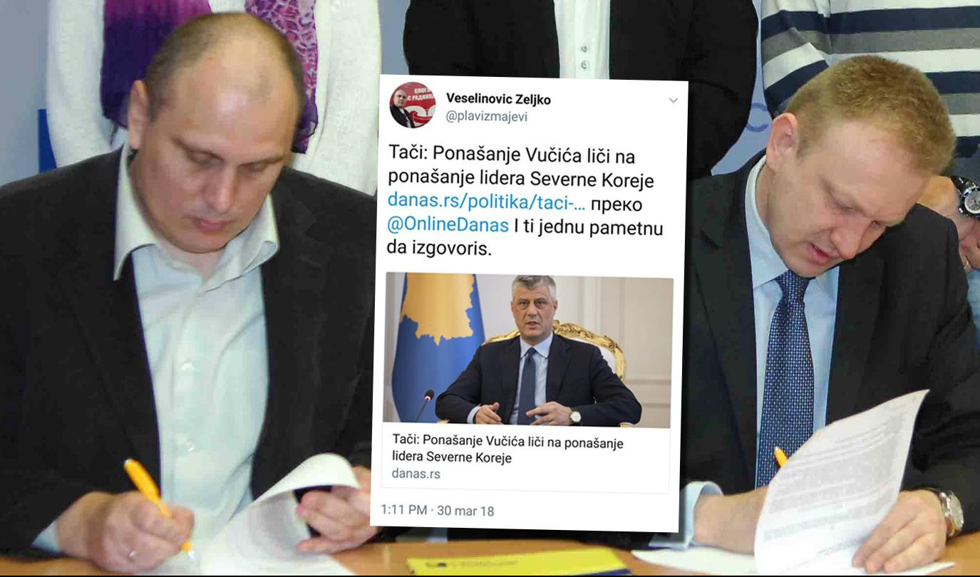Naime, Đilasov potrčko Željko Veselinović, predsednik sindikata Sloga, na tviteru se oduševio izjavom dokazanog zločnica i predsednika takozvane države Kosovo Hašima Tačija koji je za bednotiražni žuti dnevni list Danas izjavio da "ponašanje Vučića liči na ponašanje lidera Severne Koreje".
