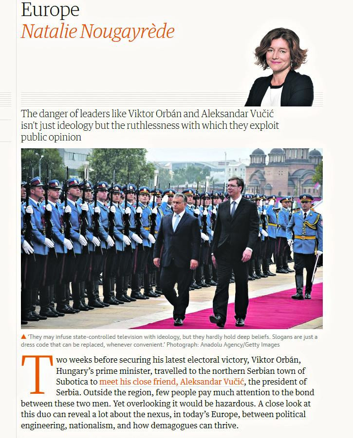Prema njihovim tvrdnjama, Vučić i Orban su "opaki" nacionalisti koji se pretvaraju da su za Evropsku uniju!?! Interesantno je to da "Gardijan" ni rečju ne pominje ratno huškanje Hašima Tačija, brutalno hapšenje Marka Đurića ili to što se Evropska unija otvoreno stavila na stranu šiptarskih terorista.