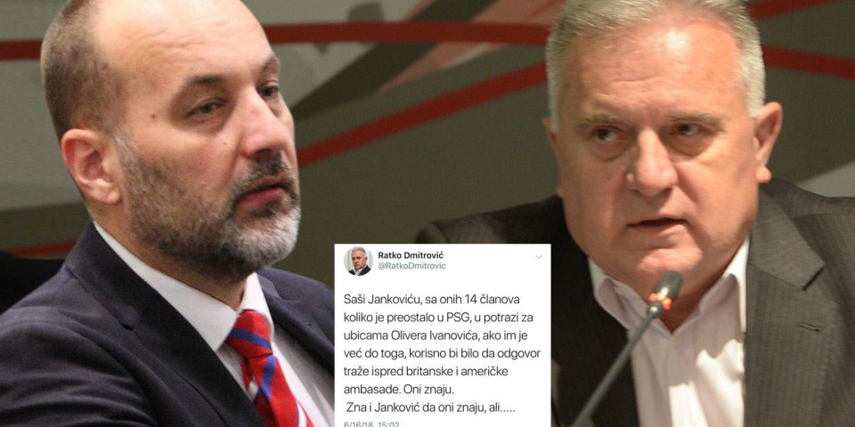 - Saši Jankoviću, sa onih 14 članova koliko je preostalo u PSG, u potrazi za ubicama Olivera Ivanovića, ako im je već do toga, korisno bi bilo da odgovor traže ispred britanske i američke ambasade. Oni znaju. Zna i Janković da oni znaju, ali... - napisao je Dmitrović.