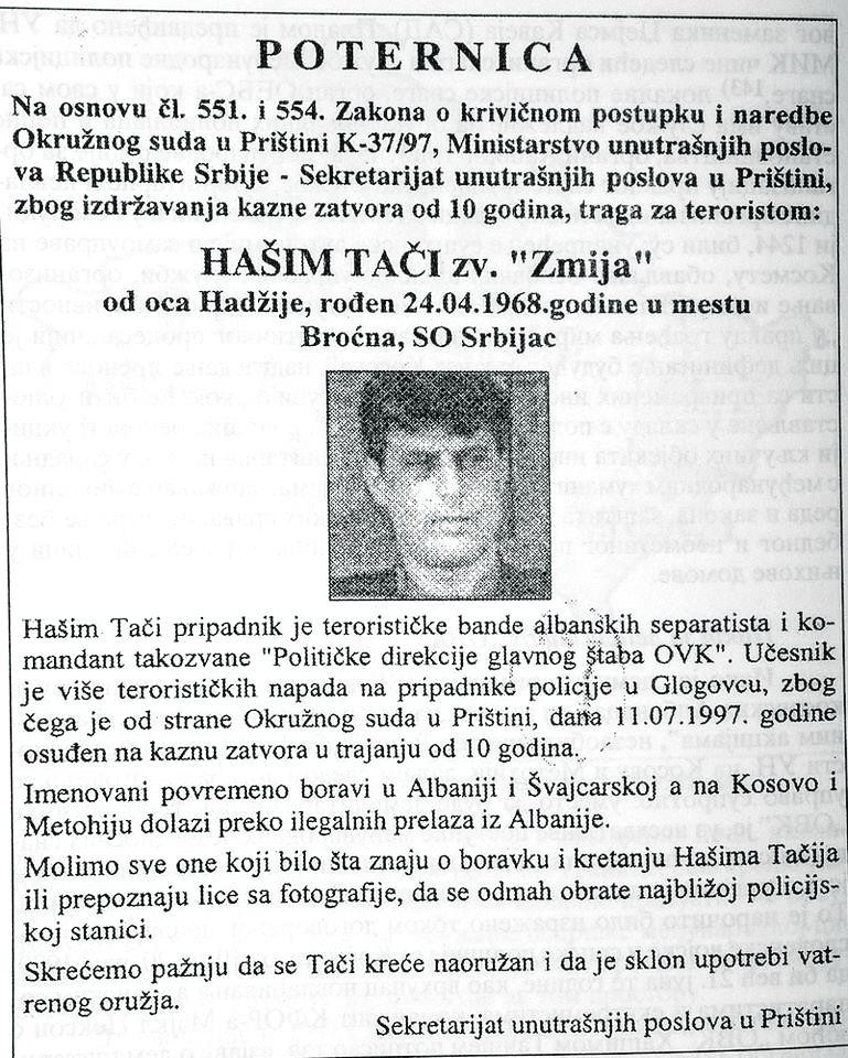 Lidera šiptarske kvazidržave i nekada glavnog komandanta terorističke OVK iz Drenice u Srbiji terete dve poternice. Prvom poternicom raspisanom još 1997. on se traži jer je od strane okružnog suda u Prištini osuđen u odsustvu na deset godina zatvora zbog ratnih zločina. Istovremeno, Srbija je protiv njega 18. marta 2002. godine raspisala poternicu zbog genocida.
