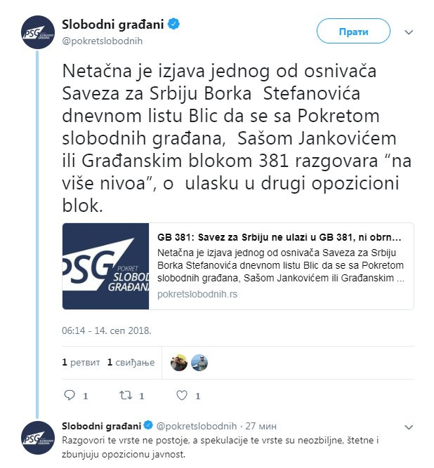 - Netačna je izjava jednog od osnivača Saveza za Srbiju Borka Stefanovića dnevnom listu Blic da se sa Pokretom slobodnih građana, Sašom Jankovićem ili Građanskim blokom 381 razgovara “na više nivoa”, o ulasku u drugi opozicioni blok. Razgovori te vrste ne postoje, a spekulacije te vrste su neozbiljne, štetne i zbunjuju opozicionu javnost - napisao PSG na svom Tviteru.