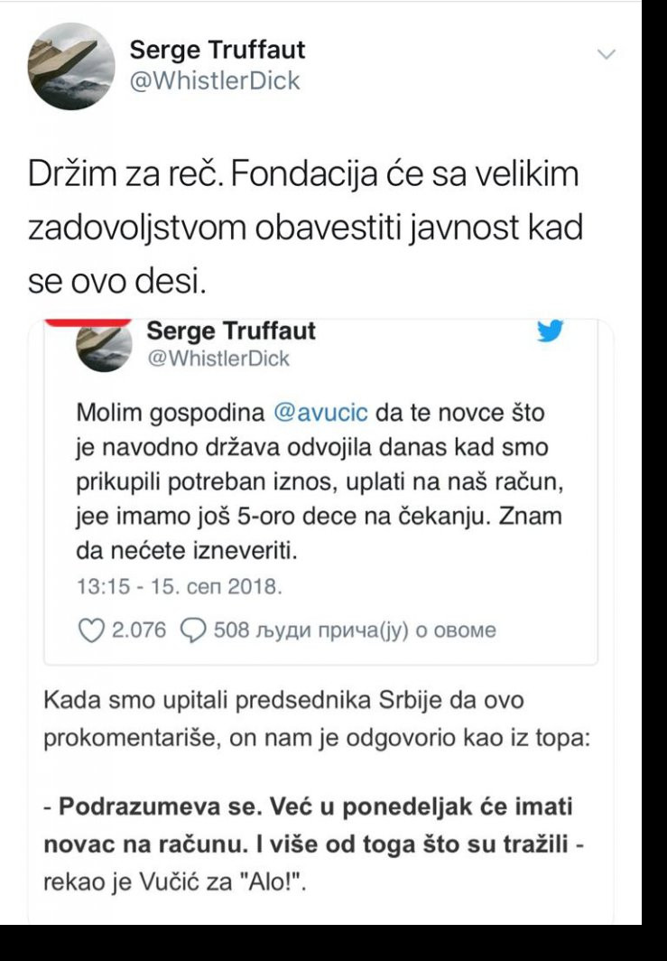 Čak je i na Tviteru Sergej Trifunović javno obećao da će "sa zadovoljstvom obavestiti javnost" kada obećanih 250.000 bude uplaćeno na račun njegove fondacije, ali se to nije dogodilo.
