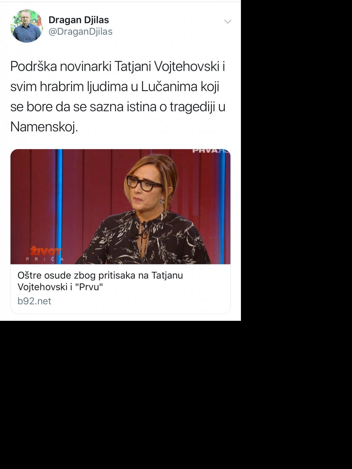 Đilas je na svom profilu pružio voditeljki punu podršku kako kaže "u borbi da se sazna istina o tragediji u Namenskoj".