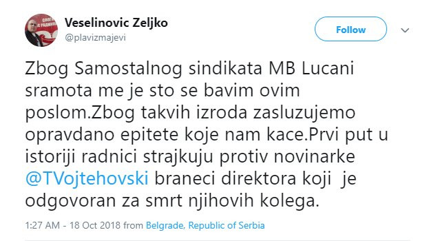 - Zbog samostalnog sindikata MB Lučani sramota me je što se bavim ovim poslom. Zbog takvih izroda zaslužujemo opravdano epitete koje nam kače. Prvi put u istoriji radnici štrajkuju protiv novinarke braneći direktora koji je odgovoran za smrt njihovih kolega - napisao je Veselinović.