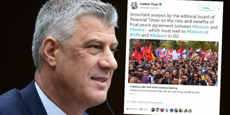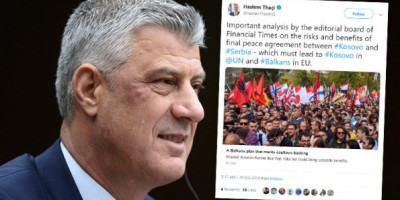 - Značajna analiza redakcije ''Fajnenšal tajmsa'' o rizicima i dobrobitima konačnog mirovnog sporazuma između Kosova i Srbije - koji mora da vodi učlanjenju Kosova u UN i Balkana u EU - objavio je Tači juče na Tviteru uz link koji vodi do teksta britanskog lista.