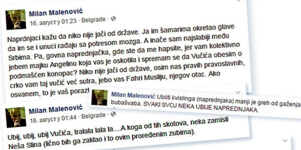 Podsetimo, sindikalac Nebojša Aleksić poznat je tome što je javno govorio da bi premlaćivao predstavnike aktuelne vlasti, njegov kolega Željko Veselinović je pozivao na silovanje premijerke Ane Brnabić, dok je zamenik urednika opskurnog "Tabloida" Milan Malenović pretio Vučiću da će ga "obesiti podmašćenim konopcem".