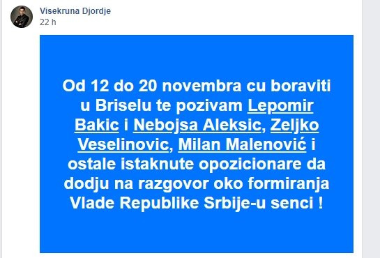 - Od 12. do 20. novembra ću boraviti u Briselu te pozivam Lepomira Bakića, Nebojšu Aleksića, Željka Veselinovića, Milana Malenovića i ostale istaknute opozicionare da dođu na razgovor oko formiranja Vlade Republike Srbije u senci - napisao je Višekruna.
