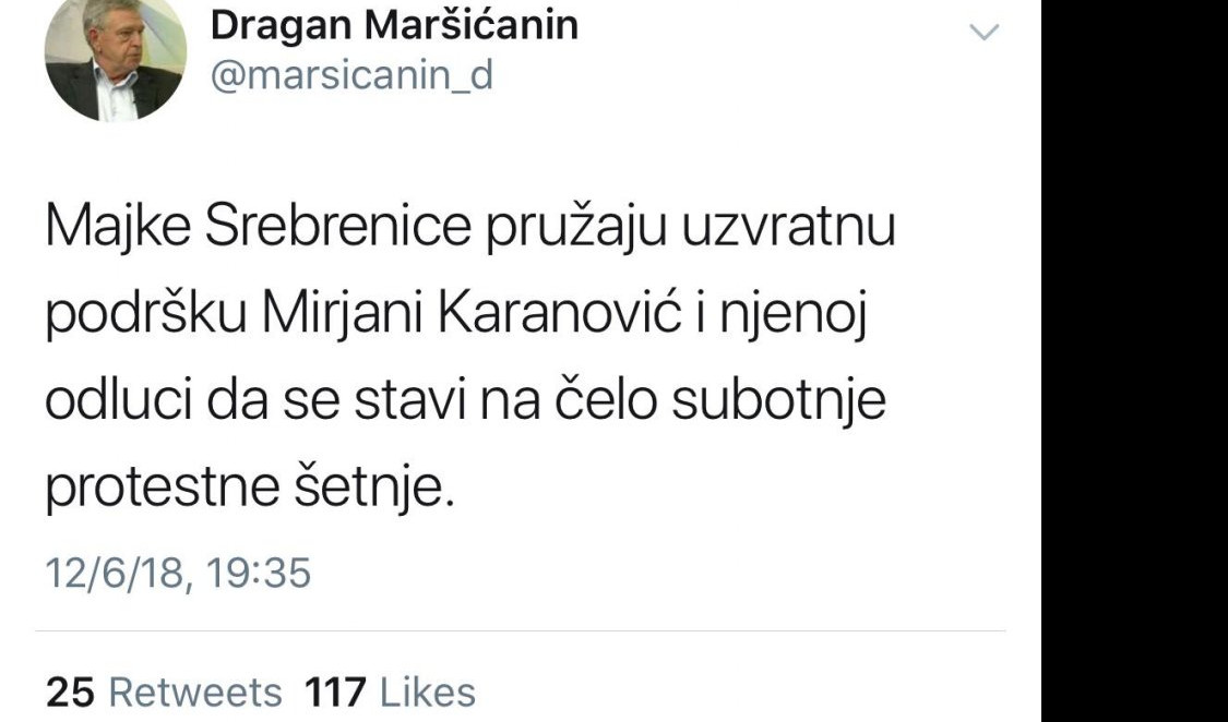 - Majke Srebrenice pružaju uzvratnu podršku Mirjani Karanović i njenoj odluci da se stavi na čelo subotnje protestne šetnje - napisao je na svom tviter profilu Maršićanin i tako potvrdio ko sve stoji iz najavljenih "mirnih" protesta.