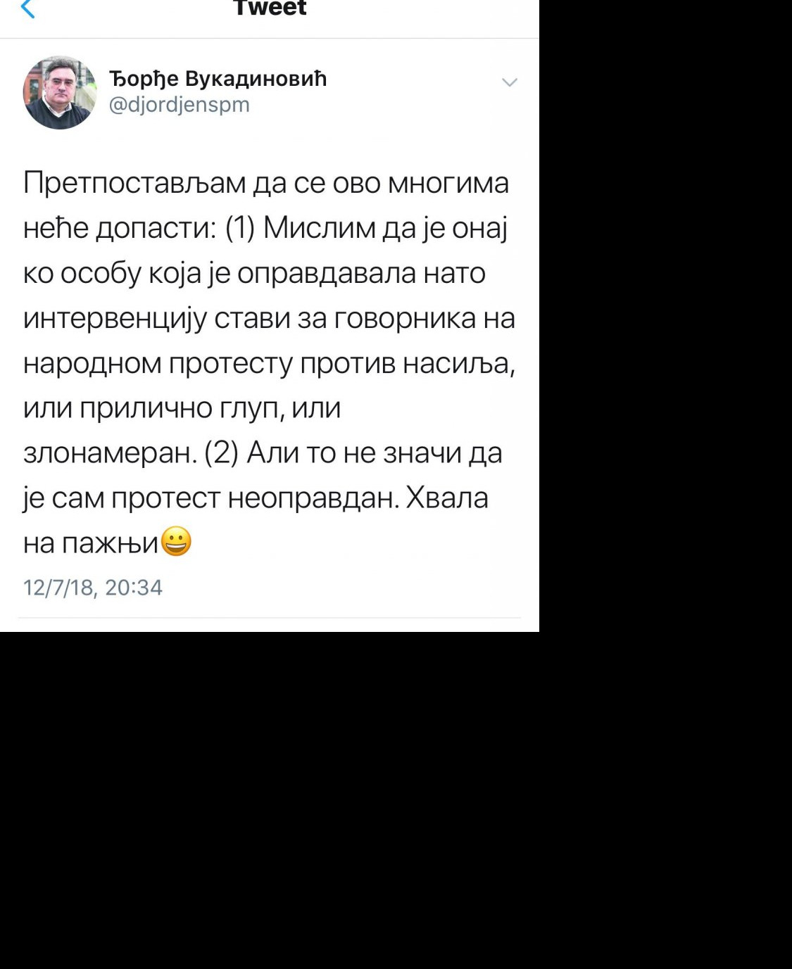 - Pretpostavljam da se ovo mnogima neće dopasti: Mislim da je onaj ko osobu koja je opravdavala nato intervenciju stavi za govornika na narodnom protestu protiv nasilja, ili prilično glup, ili zlonameran - napisao je na svom Tviter nalogu Vukadinović.
