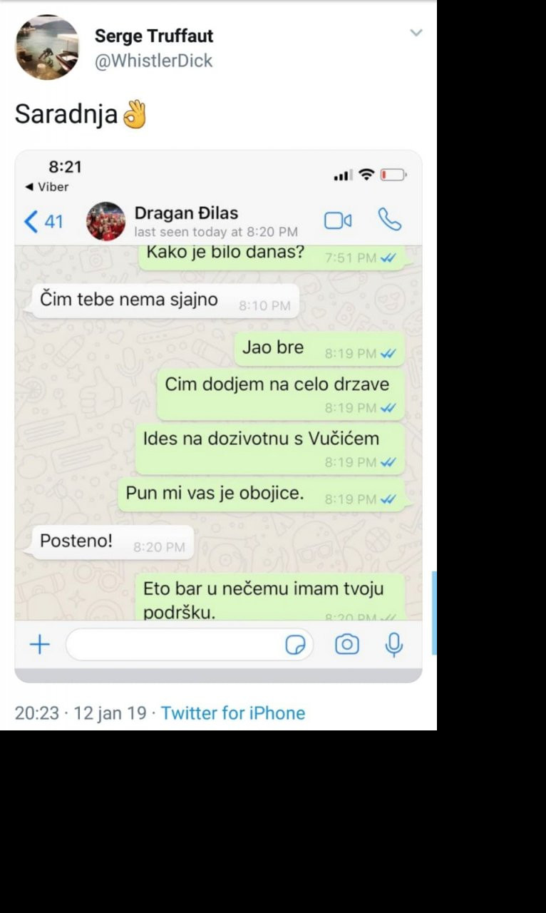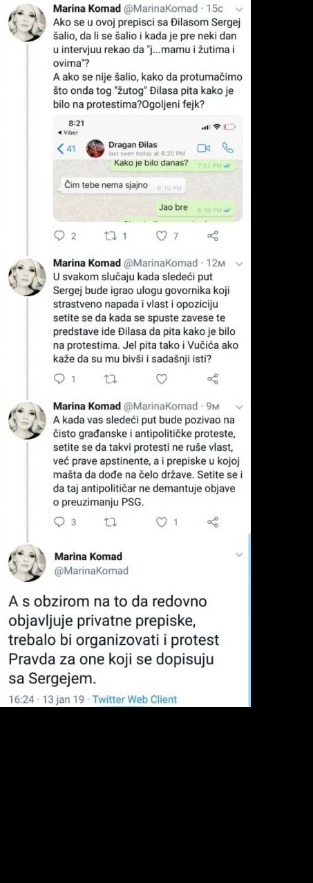 - Ako se u ovoj prepisci sa Đilasom Sergej šalio, da li se šalio i kada je pre neki dan u intervjuu rekao da "j...mamu i žutima i ovima"? A ako se nije šalio, kako da protumačimo što onda tog "žutog" Đilasa pita kako je bilo na protestima?Ogoljeni fejk? - napisala je Komad i dodala: