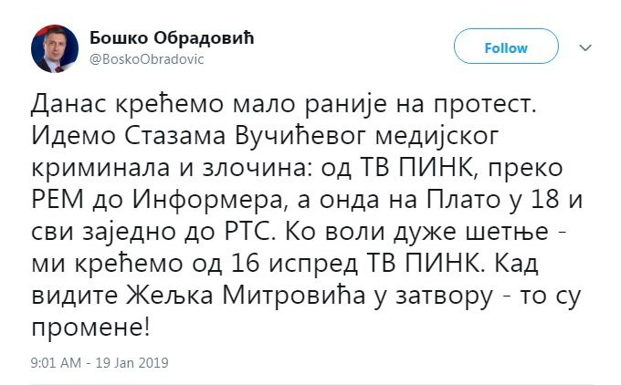 - Danas krećemo malo ranije na protest. Idemo Stazama Vučićevog medijskog kriminala i zločina: od TV PINK, preko REM do Informera, a onda na Plato u 18 i svi zajedno do RTS. Ko voli duže šetnje - mi krećemo od 16 ispred TV PINK. Kad vidite Željka Mitrovića u zatvoru - to su promene! - napisao je fašista i ženomrzac iz Čačka.