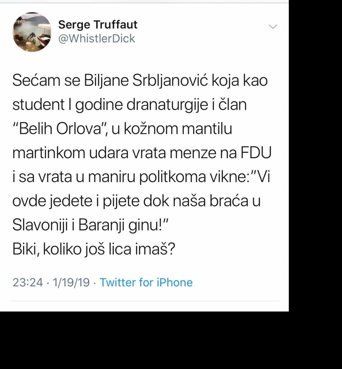 Sad, pošto se ceo dan prećutno napušava sa rođenim bratom, kineskim Sergejem, oko toga ko je glavniji u protestima, proširio je priču i na uobičajene mete, pa me uvaljuje u svoja govna. Meni je to navika od takvih ljudi i nije problem. Problem je što se desetine i desetine hiljada ljudi dižu misleći da im dva brata glumca stvarno mogu ponuditi nešto. Jedan je netalentovaniji ali je pošteniji, drugi ima mesijanski kompleks i ne može da podnese da mu je brat popularniji od njega, a vi se ceo dan raspravljate je l' mogu stranke ili ne mogu stranke, je l' treba jaja il' ne treba jaja, umesto da jednom ovde budu protesti ljudi koji će da oteraju SVA govna i da im više niko ne uvaljuje "lidere", nedovršene ljude koje Udba nije mogla da nacrta da je htela takve.