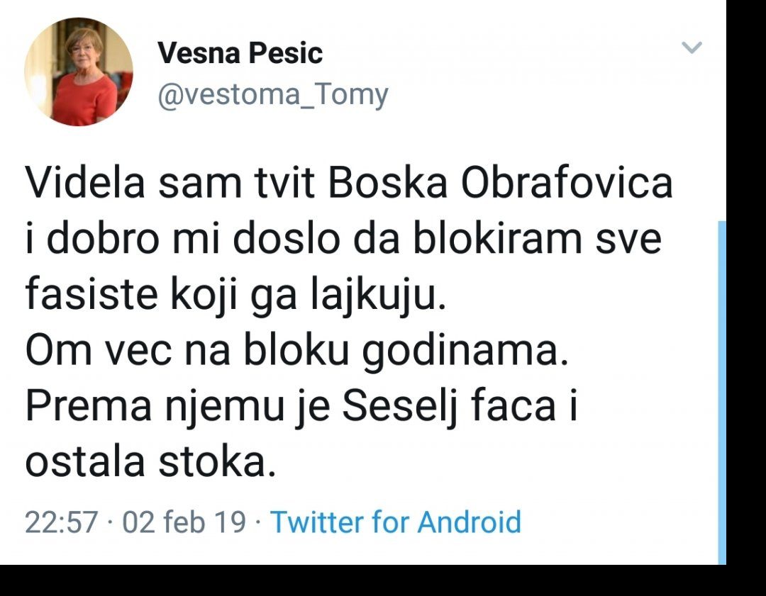 - Videla sam tvit Boška Obradovića i dobro mi došlo da blokiram sve fašiste koji ga lajkuju. On već na bloku godinama. Prema njemu je Šešelj faca i ostala stoka - napisala je Pešić.