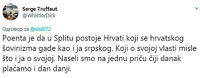 "Split nikad nije bio nacionalno nabrijan. Fetivi Splićani su levičari u duši. Poenta je da u Splitu postoje Hrvati koji se hrvatskog šovinizma gade kao i ja srpskog...", napisao je lider PSG sve upinjući se da dokaže da su Srbi loši, a Hrvati dobri.Ni to sve mu nije bio dovoljno, pa je u raspravi s mnogobrojnim tviterašima, koji nisu krili ogorčenost zbog Sergejevog ulizivanja Hrvatima, nastavio da brani 'građane' Splita.