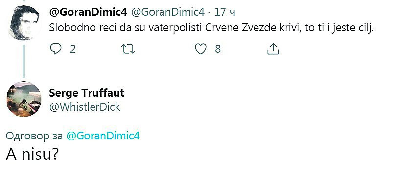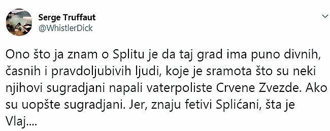 Ono što ja znam o Splitu je da taj grad ima puno divnih, časnih i pravdoljubivih ljudi, koje je sramota što su neki njihovi sugrađani napali vaterpoliste Crvene zvezde. Ako su uopšte sugrađani. Jer, znaju fetivi Splićani, šta je Vlaj...", napisao je Trifunović, na šta je jedan tviteraš primetio da je bolje da Sergej slobodno kaže da su Zvezdini igrači krivi jer mu je to očigledno cilj:
