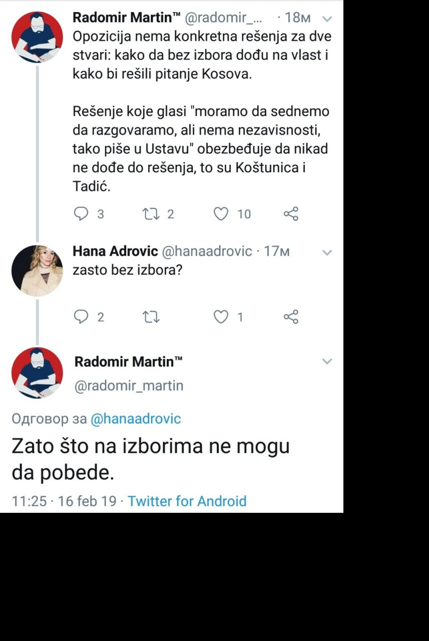 On je na svom profilu na Twiteru napisao kako opozicija nema konkretna rešenja za dve stvari: kako da bez izbora dođu na vlast i kako bi rešili pitanje Kosova.