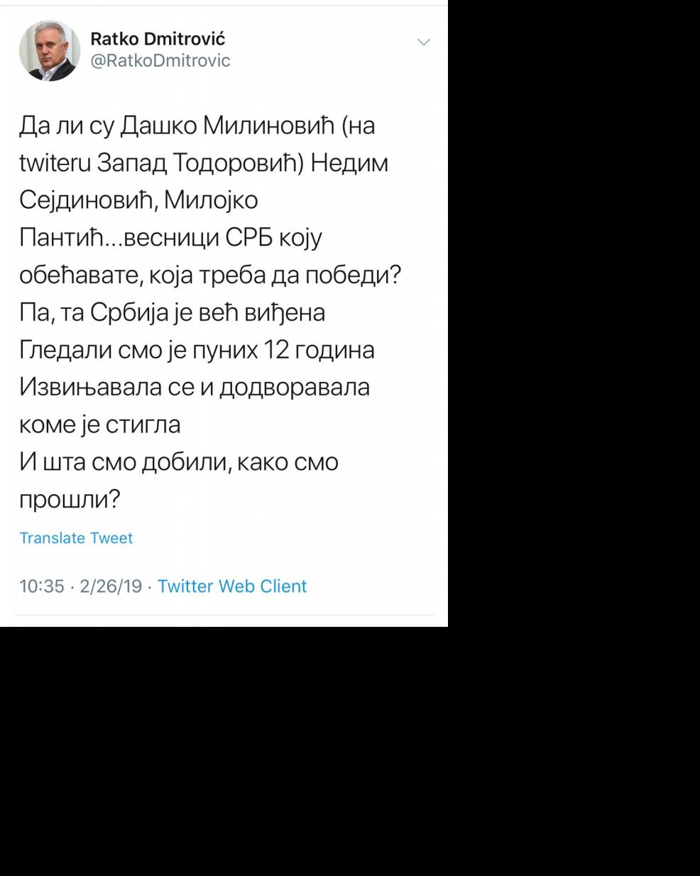- Da li su Daško Milinović (na twiteru Zapad Todorović) Nedim Sejdinović, Milojko Pantić...vesnici SRB koju obećavate, koja treba da pobedi? Pa, ta Srbija je već viđena. Gledali smo je punih 12 godina. Izvinjavala se i dodvoravala kome je stigla. I šta smo dobili, kako smo prošli?