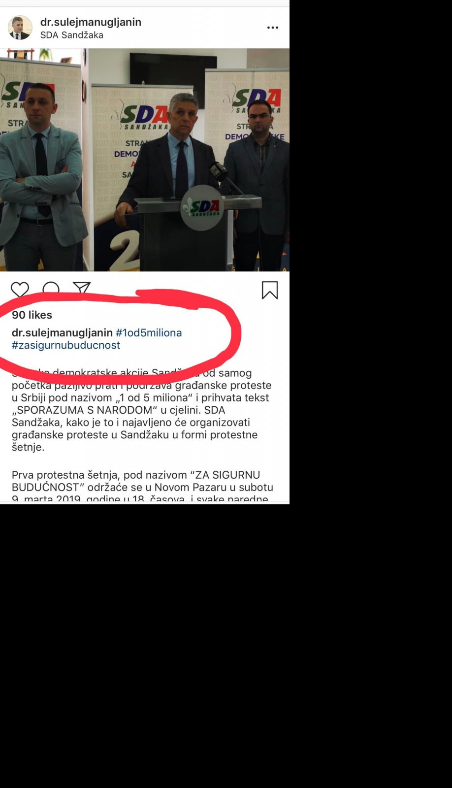 Ugljanin je danas na konferenciji za novinare najavio da će njegova SDA organizovati protestne skupove u formi protestne šetnje i da u potpunosti podržava građanske proteste u Srbiji "Jedan od pet miliona", da u potpunosti prihvata "Sporazum s narodom" Đilasa, Jeremića i Obradovića, kao i principe rada buduće ekspertske vlade.
