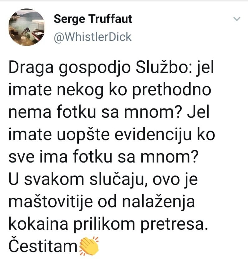 - Draga gospođo Službo, je l' imate nekog ko prethodno nema fotku sa mnom? Je l' imate uopšte evidenciju ko sve ima fotku sa mnom? U svakom slučaju, ovo je maštovitije od nalaženja kokaina prilikom pretresa. Čestitam - napisao je Trifunović na Tviteru, nastavljajući da tvrdi nešto u šta ni sam ne veruje.