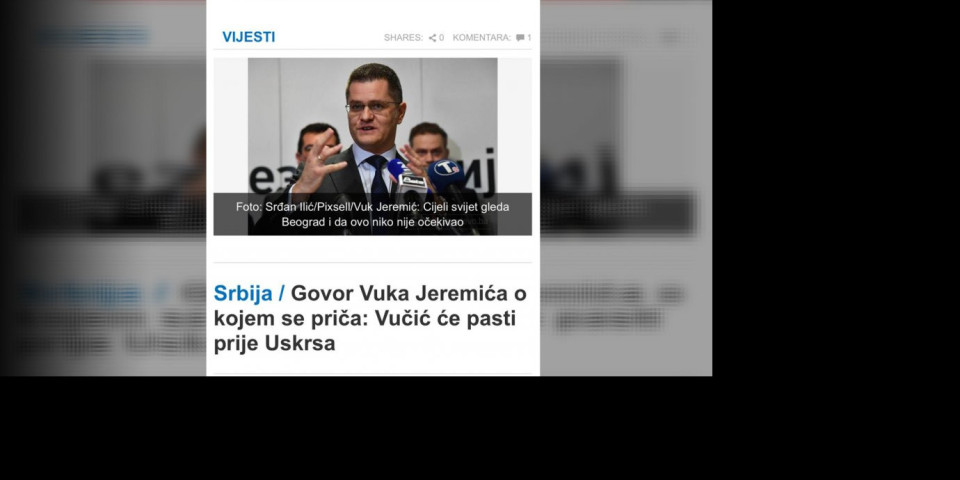 Da podsetimo, Jeremić je nedavno u intervjuu za sarajevsku FTV rekao da je Srbija kriva za sve ratove i sve zločine, da je Vučić gori od Miloševića, da Beograd treba da se distancira od Republike Srpske...