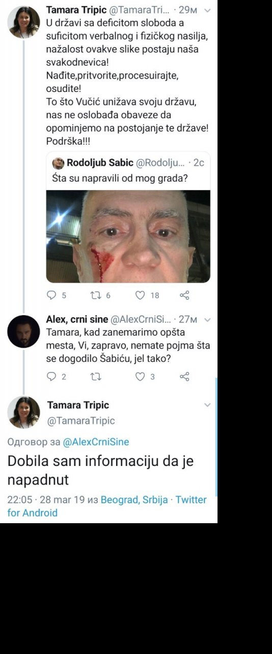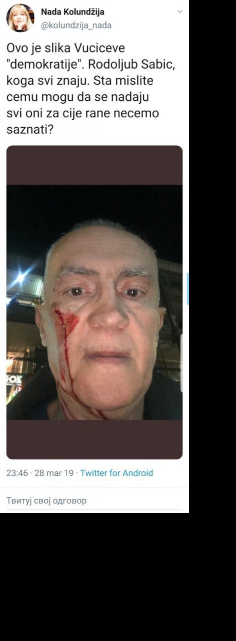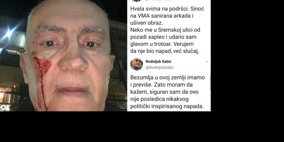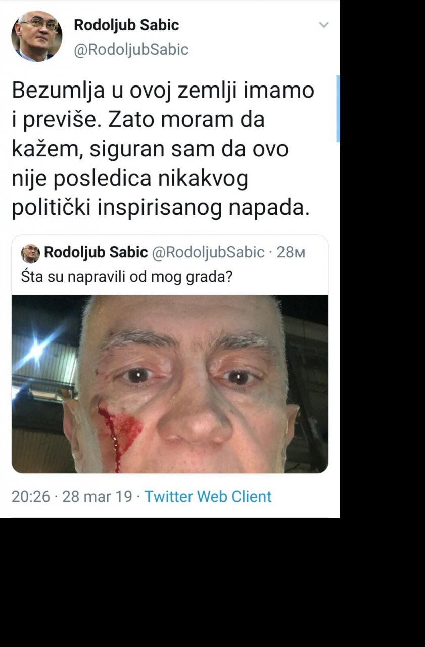 Naime, bivši poverenik za informacije od javnog značaja objavio je na Tviteru fotografiju svog okrvavljenog lica i napisao da ga je neko sapleo u Sremskoj ulici i dodao da je siguran da nije reč o političkom napadu. A to je ponovio i u jednom od narednih tvitova.