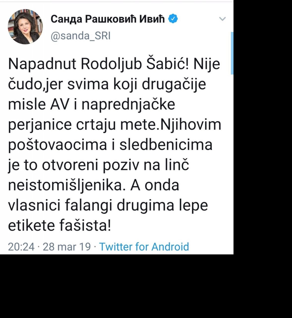 A onda se, kao po komandi, digla kuka i motika, javilo se i kuso i repato s tvrdnjama da je reč o politički inspirisanom napadu iza koga stoje Aleksandar Vučić i Nebojša Stefanović? Po neku "pametnu" na tu gnusnu laž i insinuaciju imali su da kažu svi dokazani hejteri, od Zorana Lutovca, Sande Rašković Ivić, Ivana Ninića, Nikole Jovanovića, Tamare Tripić, Nade Kolundžije, Slaviše Sekića, Janka Baljka i, naravno, neizbežnog Sergeja Trifunovića koji je otišao najdalje i Šabićev pad uporedio sa ubistvom Olivera Ivanovića!?!