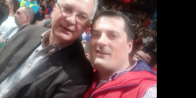 Bivši lider Demokratske stranke uslikan je kako, iz prvih redova, posmatra meč polufinala ABA lige između Crvene zvezde i Partizana.