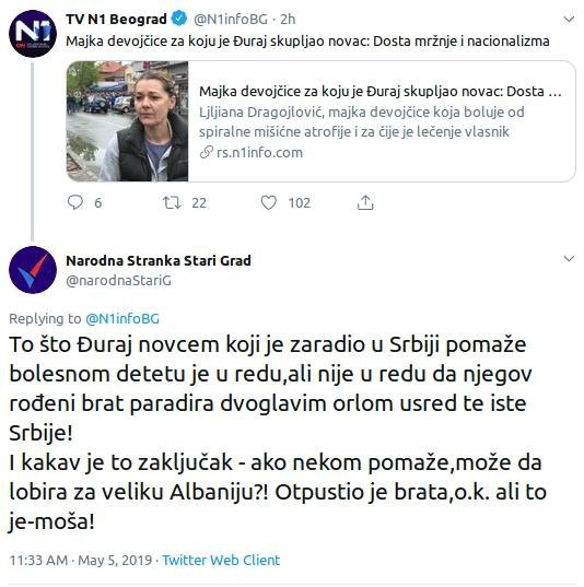 Što ste slepci. Prvi tvit vam je bio u redu. Kome se pravdate. Ili neka poštuju državu u kojoj žive ili neka biraju neku drugu. Kakve veze sada imaju filantropske aktivnosti sa promovisanjem simbola Velike Albanije. Niko nikoga ne proteruje, ali neka ode Đilas u Prištinu i pokaže tri prsta, pa da vidimo kako bi prošao. Ili oni ljudi što su branili u Štrpcu izvore pijaće vode. Kod nas u Rakiti dođu obrijani sa džipovima bez registarskih tablica, a na Kosovu Rosu. Poštujte sebe i svoj narod, gde god da živi. Ona svinjska glava je bila morbidnost, ali neko mora da opomene ljude da neke granice u ponašanju prema državi u kojoj rade i žive treba da postoje.