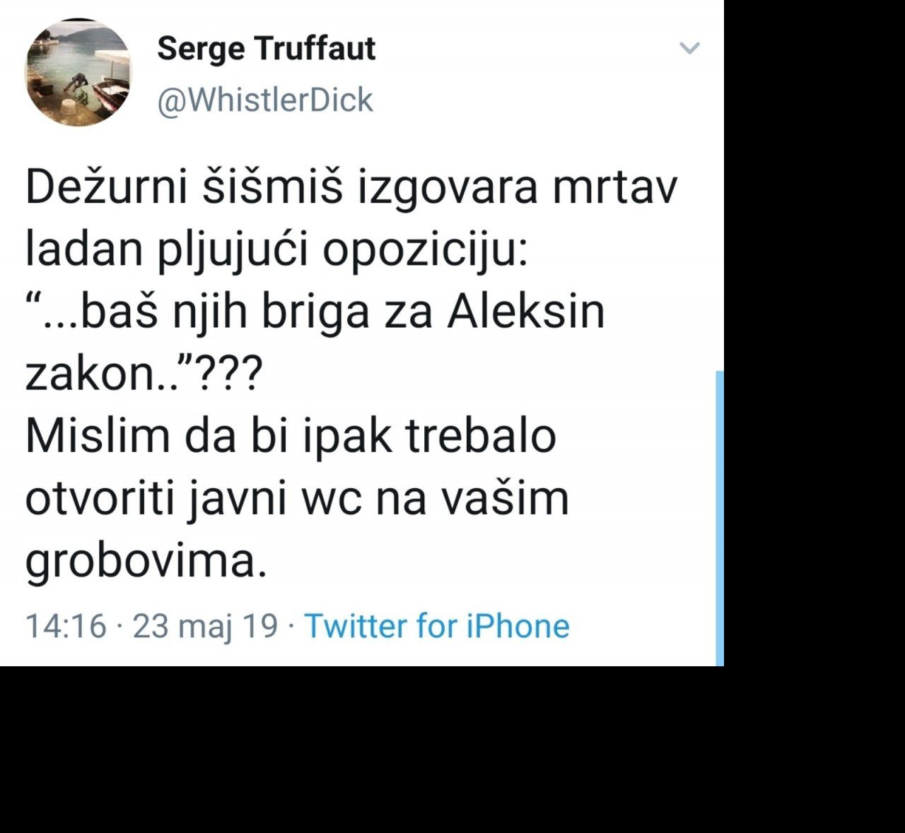Na konstataciju poslanika SNS Vladimira Orlića da da opozicione lidere ne zanima Aleksin zakon, Trifunović je u svom prostačkom stilu, napisao će otvoriti javni WC na grobovima predstavnika vlasti".